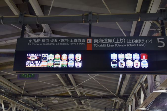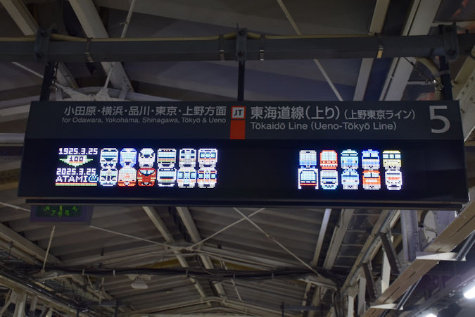 最後に熱海駅で列車案内の電光掲示板を見ると、熱海駅開業100周年を記念し、熱海駅を通る新旧様々な列車のアイコンが一斉に表示されていました。JR東日本だけでなく、国鉄、JR東海、JR貨物、伊豆急行までマニアックな車両まで再現され、実に素晴らしい企画ですね!