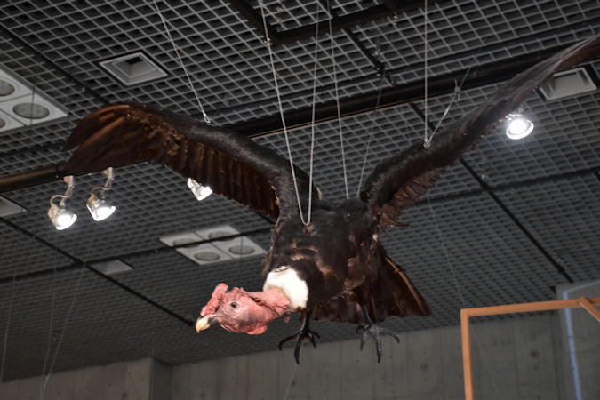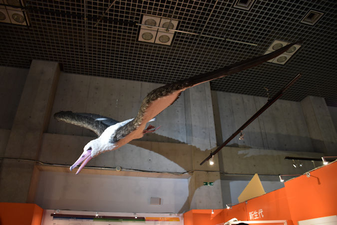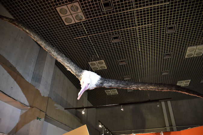 およそ2600万年前の地球に存在した史上最大の飛べる鳥類「ペラゴルニス・サンデルシ」の生体モデルで、翼を広げた大きさは、約7m!獲物(魚)を見つけて、向かってくるシーンを再現し、色は現生のアホウドリの仲間を参考しているそうです。