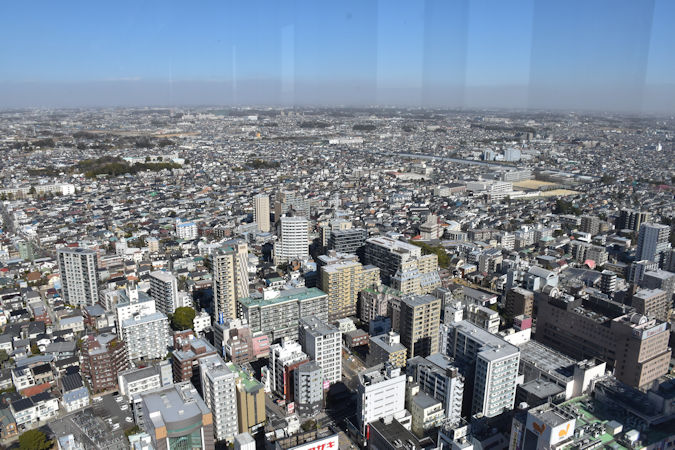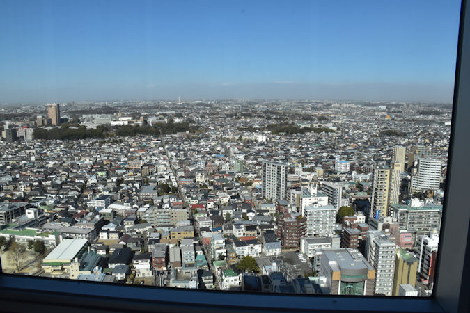 さて、まずは市川駅前にあるアイ・リンクタウン展望施設へ。ネットで見ていたところ、駅前の高層マンション「ザ・タワーズウエストプレミアレジデンス」(A街区)の45階(地上150メートル)が市川市の展望デッキとして開放されていると知り、行ってみました。まずは、市川駅から北方向。