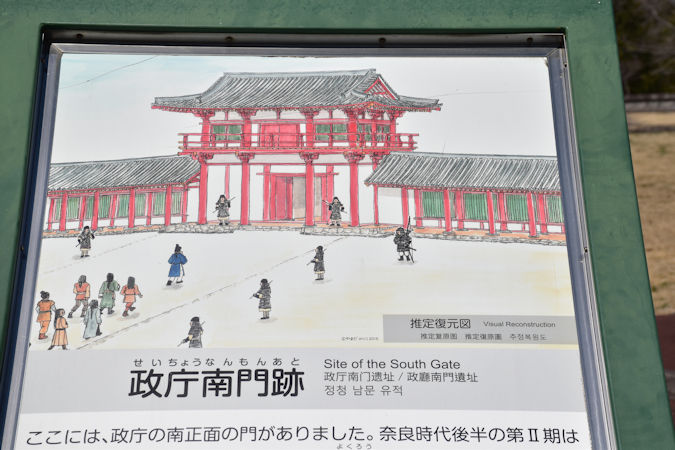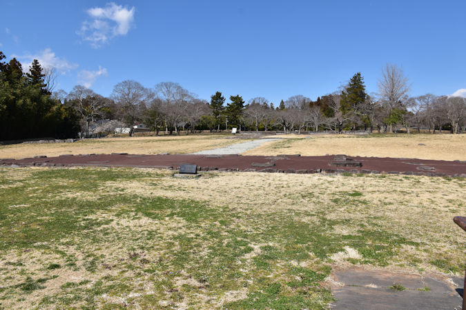 さらに、政庁南大路跡も復元されていました。こちらは外郭南門から政庁まで真っ直ぐ伸びる道路で、第1期〜第2期は13m、第3期〜第4期は23mの幅員があったと考えられます。現在は第2期の頃を想定して復元され、発掘調査を元に石垣も再現されています。
