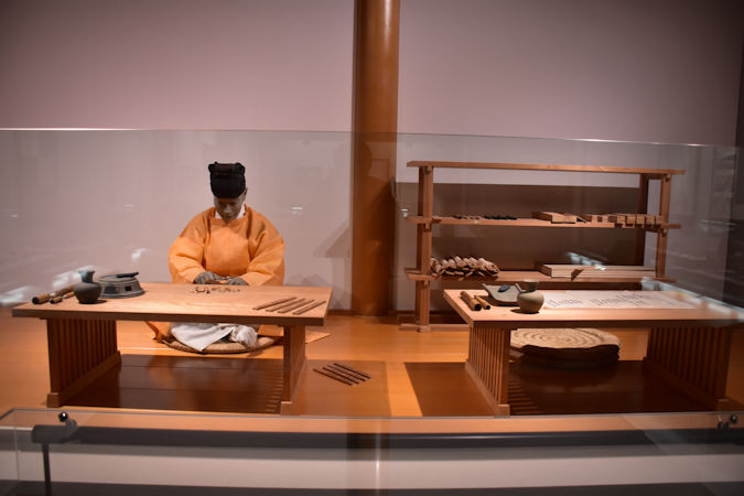 役人の執務風景。右の机には陸奥守による決裁文書が置かれ、左の机では木簡を作成しています(書き直すところを小刀で削っている様子)。