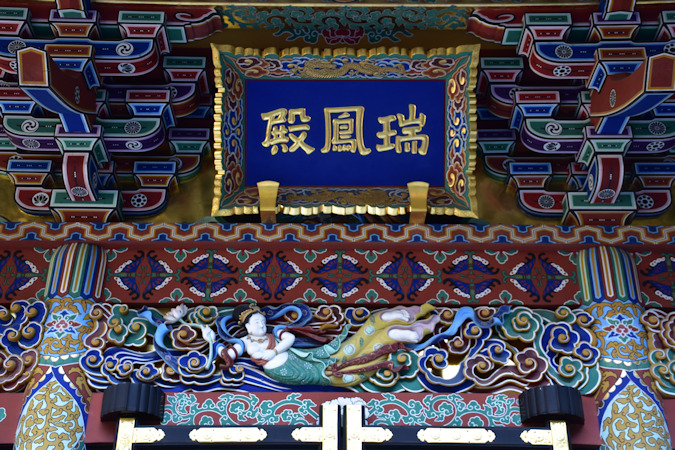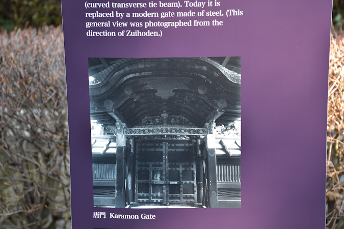 唐門。こちも焼失前と異なり簡略化されていますが、往時は天井に金箔を貼ったことから金唐門とも称されました。