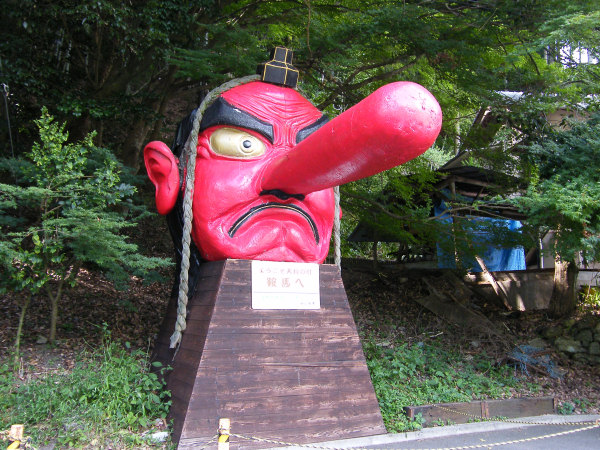 鞍馬駅といえば鞍馬天狗。駅前には鞍馬天狗の巨大な顔が鎮座されています。