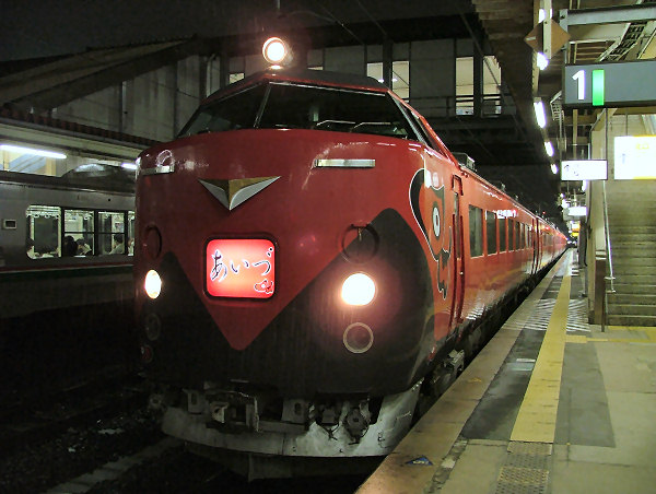 こちらは、企画特集でも紹介した485系特急「かつうらひなまつり」(安房鴨川〜勝浦〜高尾)。ていうか、これも485系なんですわね。しかも、これはこれで「会津PR用」の凄まじい塗装に変更されているわけでして・・・。ちなみに、自由席もついていたので、立川まで乗車しましたが、車内が大幅にリニューアルされていたのには驚き。