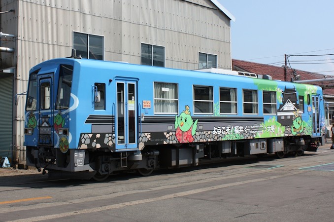 2010(平成22)年登場の、越美北線(愛称:九頭竜線)開業50周年を記念した、キハ120形200番台のラッピング車両「3号車」。こちらは、越前大野城を前面に、沿線の「一乗谷朝倉氏遺跡」の唐門と復元された武家屋敷通りをデザイン。