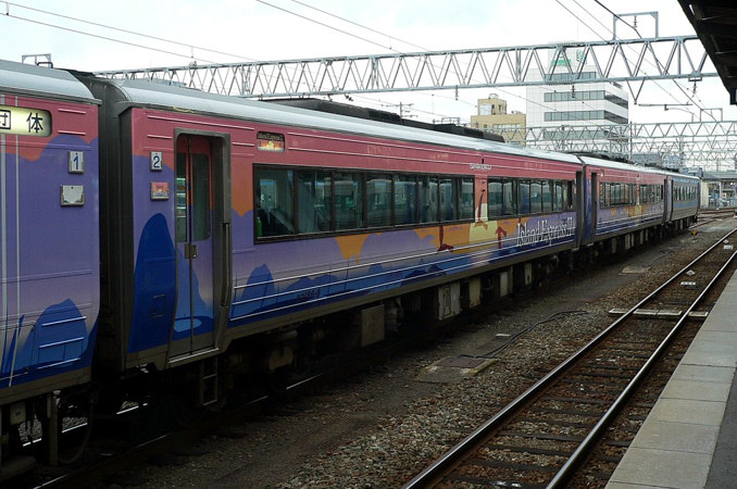 JR九州のキハ185系は、2018年から「ゆふ」「九州横断特急」のデザインを「AROUND THE KYUSHU」塗装に統一している。