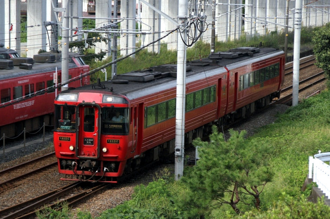 ここまでやるか(笑)、というわけでステンレス車でありながら、真っ赤になった九州横断特急用のキハ185系。ワンマン運転まで開始した。