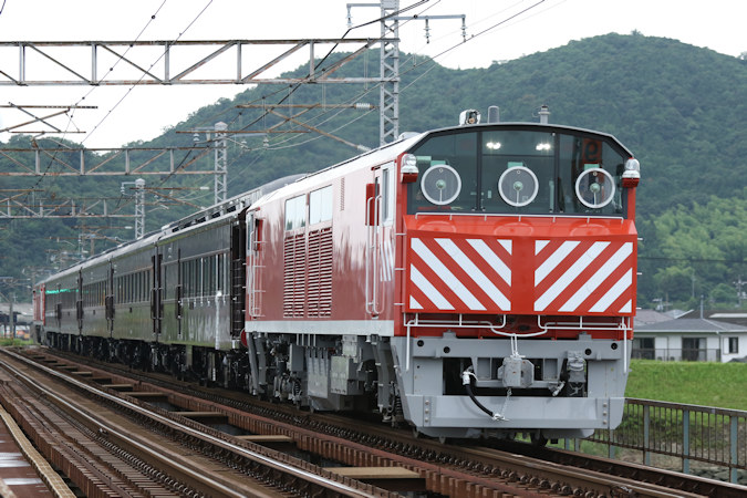 ラッセルヘッドが無い状態で、新造された35系客車をプッシュプル牽引で試運転。