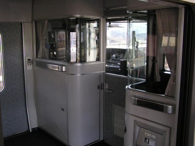 デッキから見た運転室。複雑な曲面ガラスが多用されている。