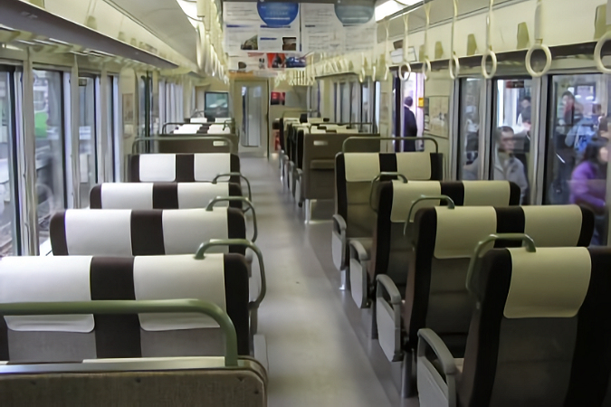 0番台の車内は基本的に223系と同じデザインの転換クロスシート(補助席あり)だが、ワンマン運転対応の為に、先頭車両の最後部の扉に整理券発行機、運転台の背後に料金表(運転席内に運賃箱)が設置している点が大きな違い。また、その関係で、乗務員室と客室の仕切扉が引き戸式になっているのも大きな特徴。(解説・撮影:うめ吉)