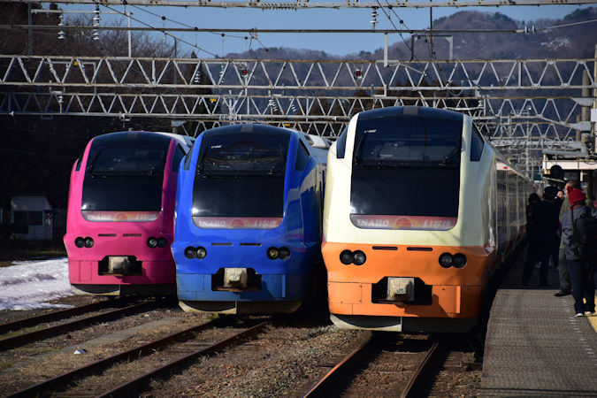 さらに2015(平成27)年3月14日改正では、北陸新幹線(長野〜金沢間)開業に伴い設定される特急「しらゆき」(新井・上越妙高〜新潟)にも運用されることになり、4両編成×4本が1100番台に改造の上で投入されることになった。塗装は、アイボリー系のホワイトをベースに、車体下部に紫紺、朱色を配色している。