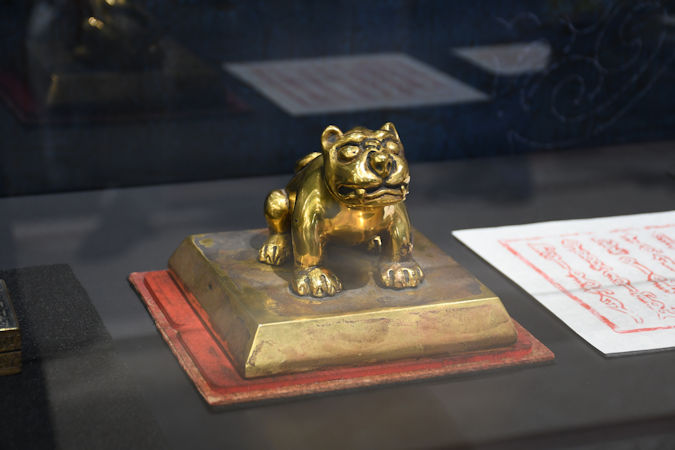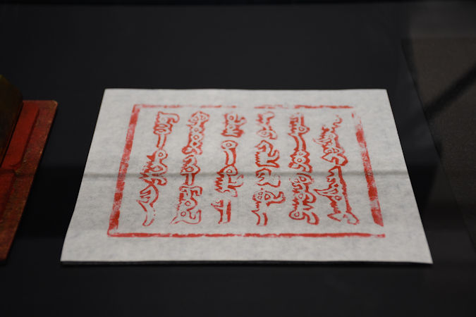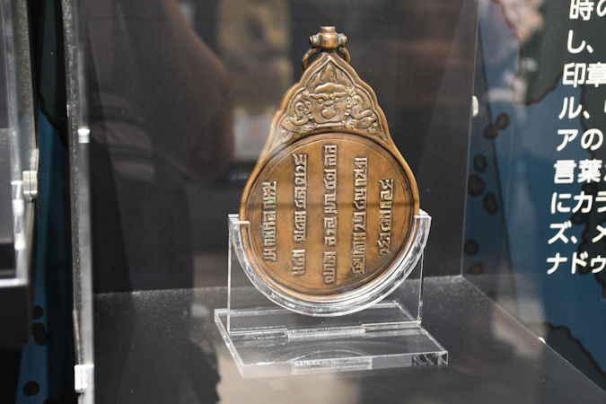チンギスハンの孫で、モンゴル帝国第3代皇帝のグユク・ハンが、1246年にローマ教皇のインノケンティウス4世に宛てた書簡で押印したもの。「永遠なる天の力により、大モンゴル帝国の海洋ハンの勅。これを受け取るものは、畏れ敬い従えよ」と記されているそうですが、一部意味が解らないような…。