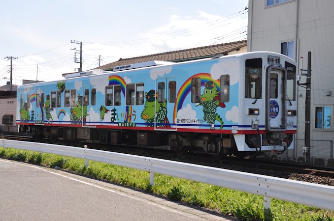 竜ヶ崎線で活躍するキハ2000形。2002号は龍ヶ崎市のマスコットキャラクター「まいりゅう」のフルラッピング車両となっている。なお、2017(平成29)年からは2代目「まいりゅう号」が運転中。