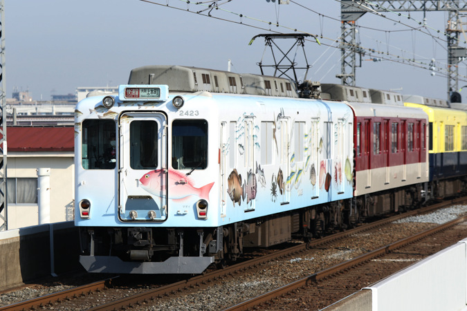 「伊勢志摩お魚図鑑」となったモ2423。これは従来の鮮魚列車専用車2680系に代わるもので、イセエビ、鯛、イワシ、マンボウなど43種類の魚が描かれている。