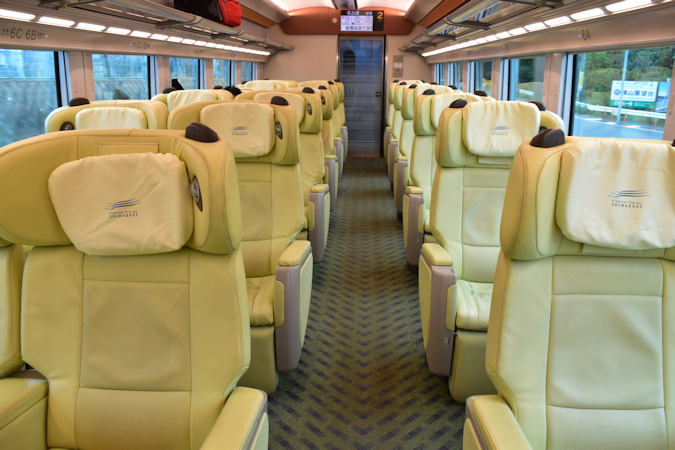モ50500形(名古屋発着5号車・難波・京都発着2号車)の車内。座席種別はプレミアムで、平床構造。