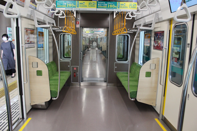 一般座席・優先席ともにグリーン系の配色。大型袖仕切には木目柄を採用している。