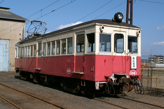 ことでんの自社発注車両で、片運転台の付随車として3両が製造された。当初は電動車と編成を組んで使用されていたが、1953(昭和28)年に電動車不足となったことから両運転台の電動車へと改造された。その後は琴平線や長尾線で増結用として使用されてきたが、後継車両の投入で廃車が進み、現在は500号のみが塗装を旧型車色となる茶色とアイボリーの2色に塗り替えられた上で動態保存として在籍している。●旧塗装
