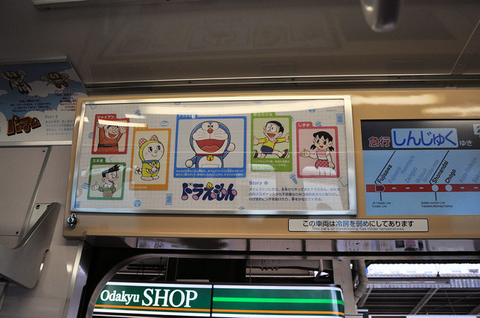 2011(平成23)年8月3日から営業運転を開始した3000形による「F−train」。これは、川崎市に藤子・F・不二雄ミュージアムがオープンすることを記念し、10両編成1本に対して、「ドラえもん」や「キテレツ大百科」「パーマン」など藤子・F・不二雄氏が手掛けた作品の代表作10作のキャラクターを車体全体にラッピングしたもの。1両ごとにデザインが異なるのが特徴で、大きな注目が集まった。ところが、このラッピング車両が東京都の屋外広告物条例に抵触していることが判明し、それを受け同年9月30日で運行を終了。内装はそのままだが、わずか2ヶ月弱で特徴的な外観はあっという間に見られなくなってしまった。このページでは、車内の様子や1両ごとのデザインをご紹介したい。