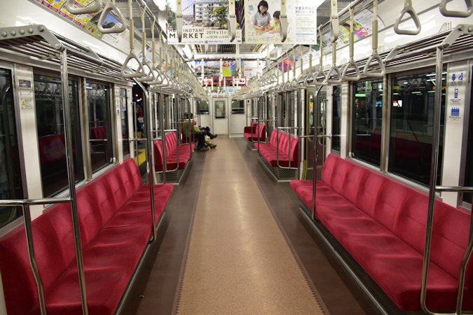 リニューアル後の内装は床を暖色系、座席は赤色のモケットに。従来は一部編成を除き、グリーンの床に青色のモケットだった。