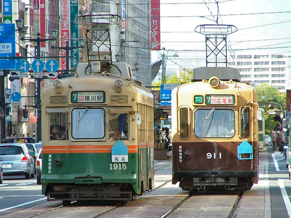 右が旧大阪市電2601形。もと京都市電の1900形と共に活躍するのも、広島電鉄ならでは。