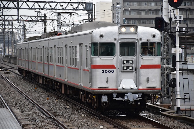 3000系トップナンバー編成。種別表示器、行先表示器が飛び出しているのも特徴。