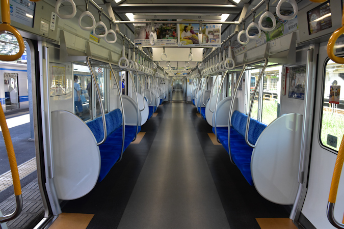 座席のモケットは青色で、袖仕切は丸みを帯びた「たまご」形状。