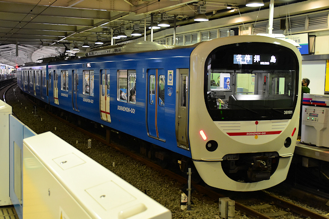 ラッピング電車「DORAEMON−GO!」。2020(令和2)年10月8日(木)から30000系38101Fを用いて運転されている。詳しくは別ページを参照。