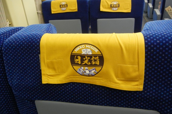 「日光詣」塗装は、座席カバーを黄色とし(通常は白色)、ロゴマークとイラストも掲出。
