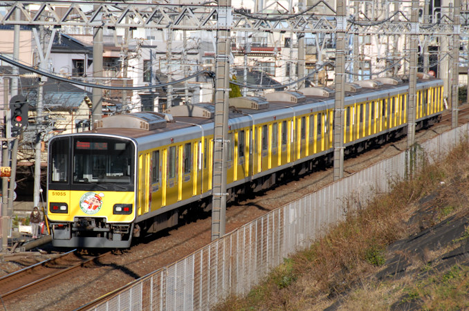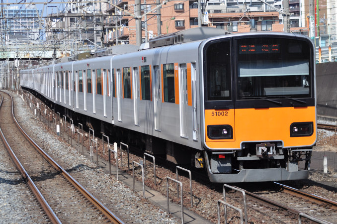 東京メトロ有楽町線、副都心線乗り入れ対応の、東上線系統で活躍する50070系。フルカラーの行先表示機を採用。副都心線に設置されたホーム柵との関係で、先頭車のみ全長が130mm長くなるため、50050系と区別された。
