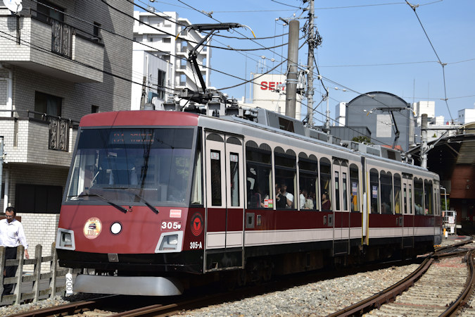 305Fは2017(平成29)年4月10日から、玉川電気鉄道(玉電)開業110周年を記念し、開業当時の狭軌車輌をイメージしたラッピング車両となっている。