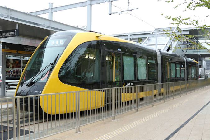 宇都宮ライトレールが運用するHU300形は、新潟トランシス製の超低床電車(LRV)で3車体連接車で、全17編成が導入。編成長は29.52m、全幅は2.65mであり、同じ3車体連接車の福井鉄道F1000形より編成長が約2.4m長く、国内最大級の大きさである。これにより、定員は国内の低床車両では最大となる約160人(うち座席50人)となっている。外観は流線形の先頭形状とイエローの車体色が特徴。車内はボックスシートが基本で、車椅子スペースは1編成につき2カ所(運転台後方)を設けているほか、中間車にフリースペースを設けている。また、窓のロールカーテンは宇都宮の伝統工芸「宮染め」のイメージでデザインされている。さらに、日本で初めて全ての乗降扉にICカードリーダーを設置している。