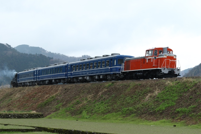 2015(平成27)年4月11日に運転された「鳥取県発地方創生号」。C12 167と12系客車3両を、DD16 7の牽引で若桜〜八東を往復する形で運転したもので、C12は無火状態であったものの薪を燃やして出た煙が煙突から出る仕掛けとなっていました。