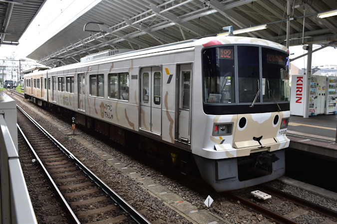 2018(平成30)年10月11日に登場した「うしでんしゃ」。Y003編成に雪印こどもの国牧場の「牛」をイメージした白黒の牛模様がラッピングされている。
