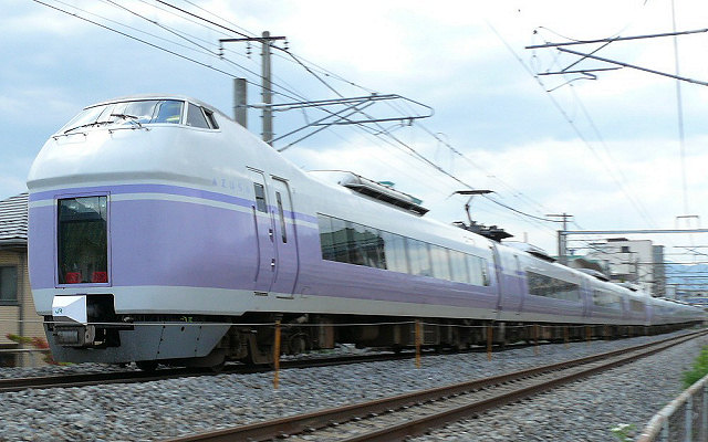 団体列車用ハイグレード車両、E655系の往路返却回送(後追い/上写真)と、茅野駅へ向かうE351系スーパーあずさ15号(こちらも後追い)です。スーパーあずさ15号は速達便に入る便で、新宿→松本を2時間半弱で結びます。