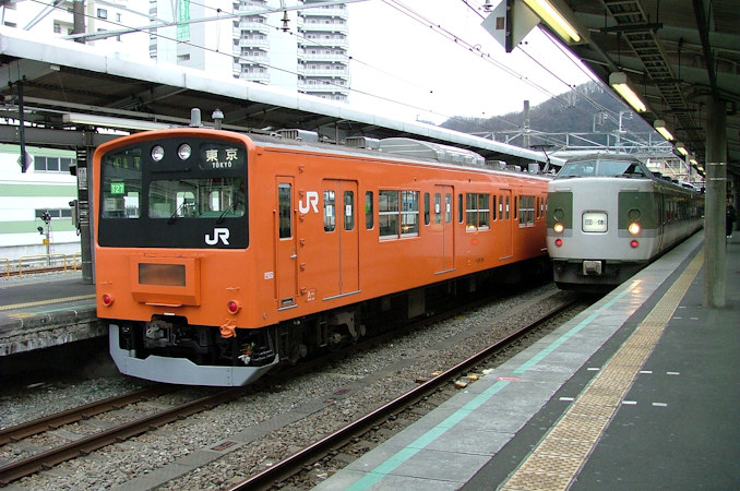 立川駅に停車中の「ホリデー快速河口湖」。南武線の205系と。