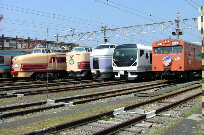 この日は三鷹電車区のイベントで、歴代「あずさ」などが展示。勝田電車区の485系ボンネット(訓練車)はヒゲを消して181系風で登場。