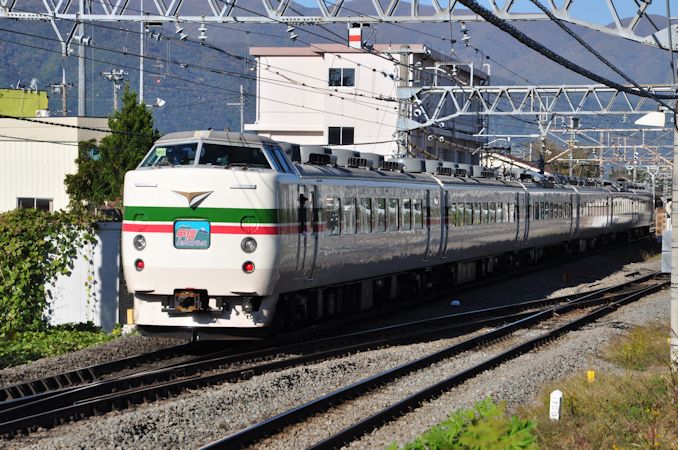 安茂里駅を通過する189系N101編成による「しなのサンライズ」。