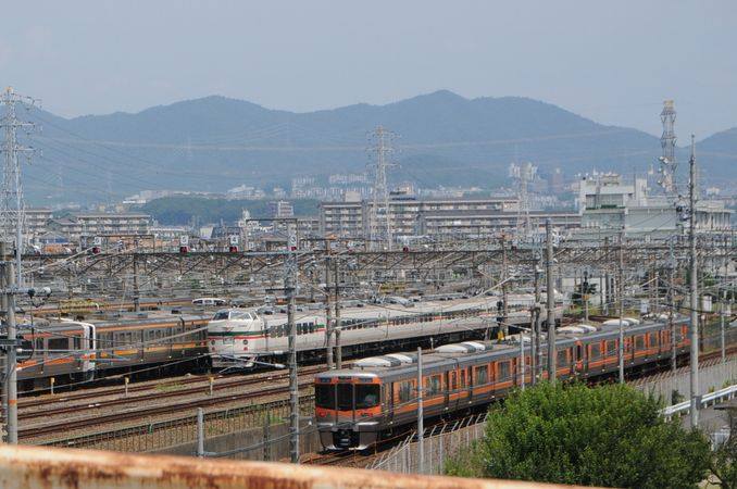 夏季の臨時列車として設定された臨時特急「木曽あずさ」。新宿〜南木曽間の運転ながら、神領電車区まで回送。JR東海の車両に囲まれることに。