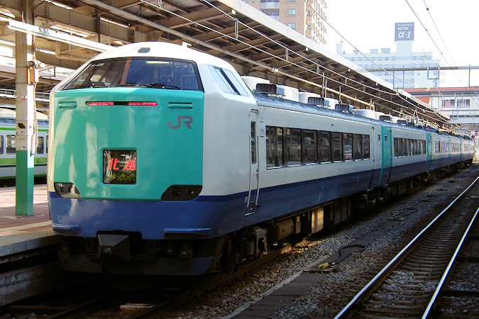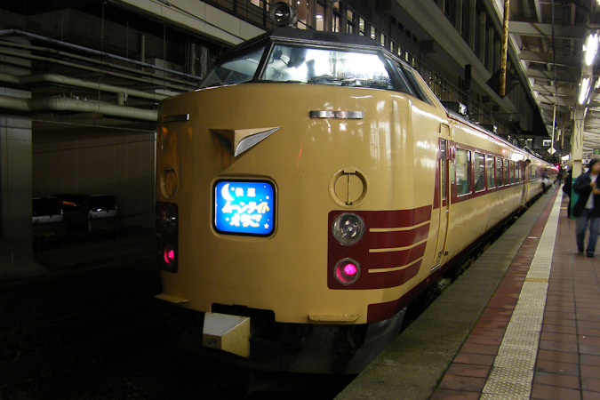 新潟駅で出発を待つ快速「くびき野」。新ニイT17編成で、特急シンボルマークのない新潟方先頭車クハ481-332が特徴。元々は勝田電車区に所属し、特急「ひたち」で活躍していたもの。