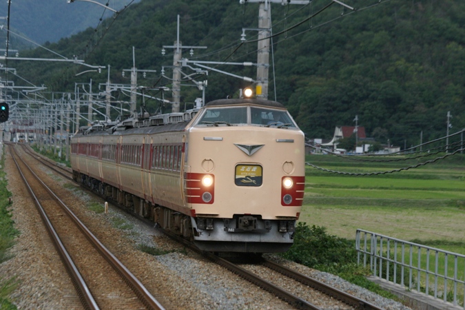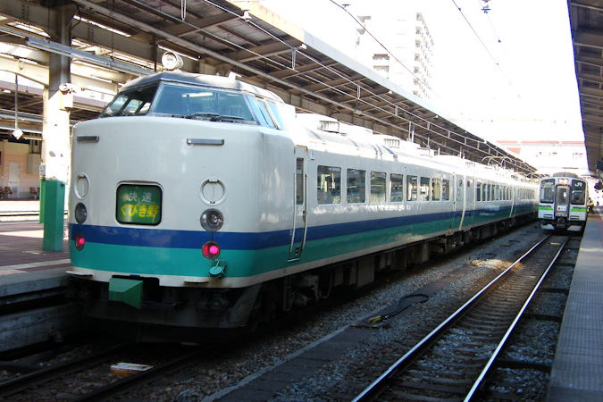 会津若松駅にて。485系の代走に入った583系による快速「あいづライナー」との並び。