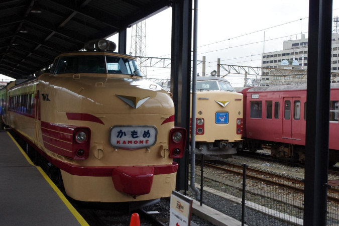 九州鉄道記念館で開催された「鉄道の祭典」(11月9日〜11日)の一環で、415系国鉄色(南福岡運転所Fm-5編成)と485系国鉄色(鹿児島総合車両所DK-9編成)が並べられて展示