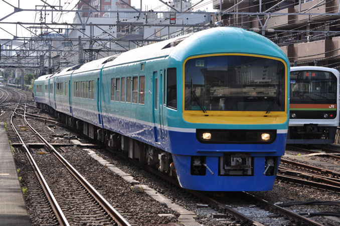 「やまなみ」。1999年に誕生した、高崎車両センター所属の和風ジョイフルトレイン。「せせらぎ」とほぼ同型で、「やまなみ」の方が少し早く登場している。「せせらぎ」とは併結運転をすることも多かった。「せせらぎ」同様、2011(平成23)年に「リゾートやまどり」に再改造され消滅。(写真:横須賀線 北鎌倉駅/撮影:裏辺金好)