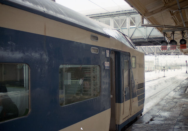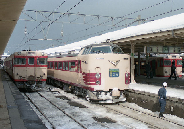 盛岡行きの485系特急「たざわ」が待機中。先頭車化改造された雰囲気が良く解ります。
