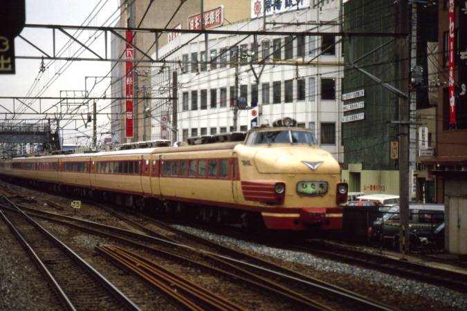 松戸駅に入線する485系特急「ひたち」。先頭は九州で活躍したヒゲなし、赤スカートのボンネット車