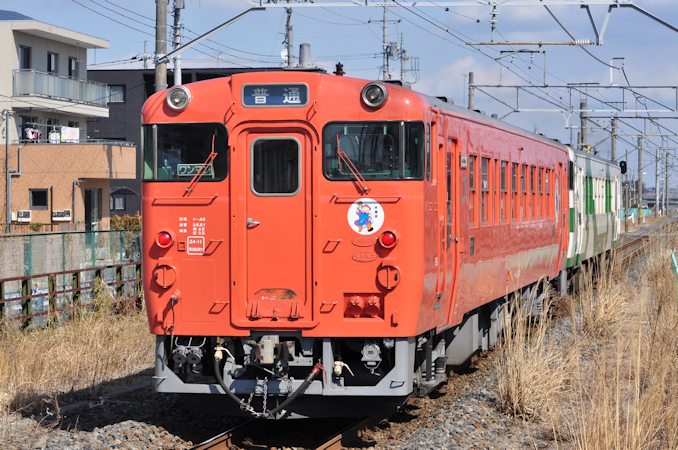 宝積寺駅に停車中のキハ40形。キハ10形に塗られていた国鉄色ツートンカラーを再現した塗装。