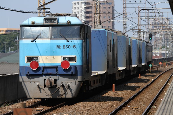 北朝霞駅を通過するEF81形牽引の貨物列車。