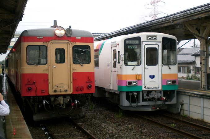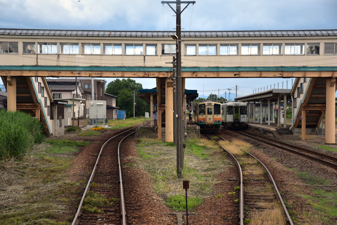 米沢駅構内に停泊中のキハ52形+キハ40系。どちらも国鉄色と、国鉄時代のような雰囲気。
