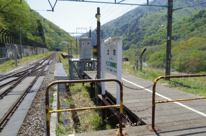 上り線ホームの湯檜曽寄りは1998年(平成10年)の土砂崩れで破壊されて以来そのまま。