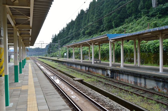 駅舎は2004(平成16)年の新潟県中越地震で被災し、翌年再建されたものである。構内は2面3線構造だが、中線は保守用となっている。