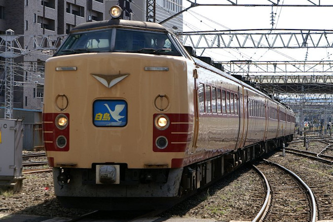 485系国鉄色編成が臨時で特急「白鳥」に充当された場合は、旧トレインマークが掲出されていた。(撮影:デューク)